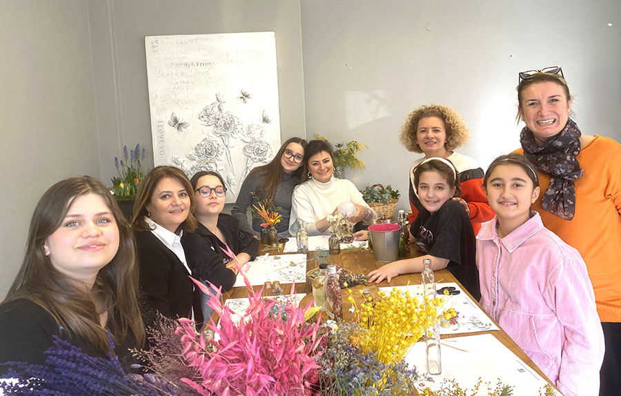 Çiçeklerin katılımcıların üzerinde yarattığı olumlu etkilerin ışığında aromatik bitkilerin zihin açıcı kokuları eşliğinde ürün tasarımı, renk bilgisi atölyeye konu olan deneyimlerden.